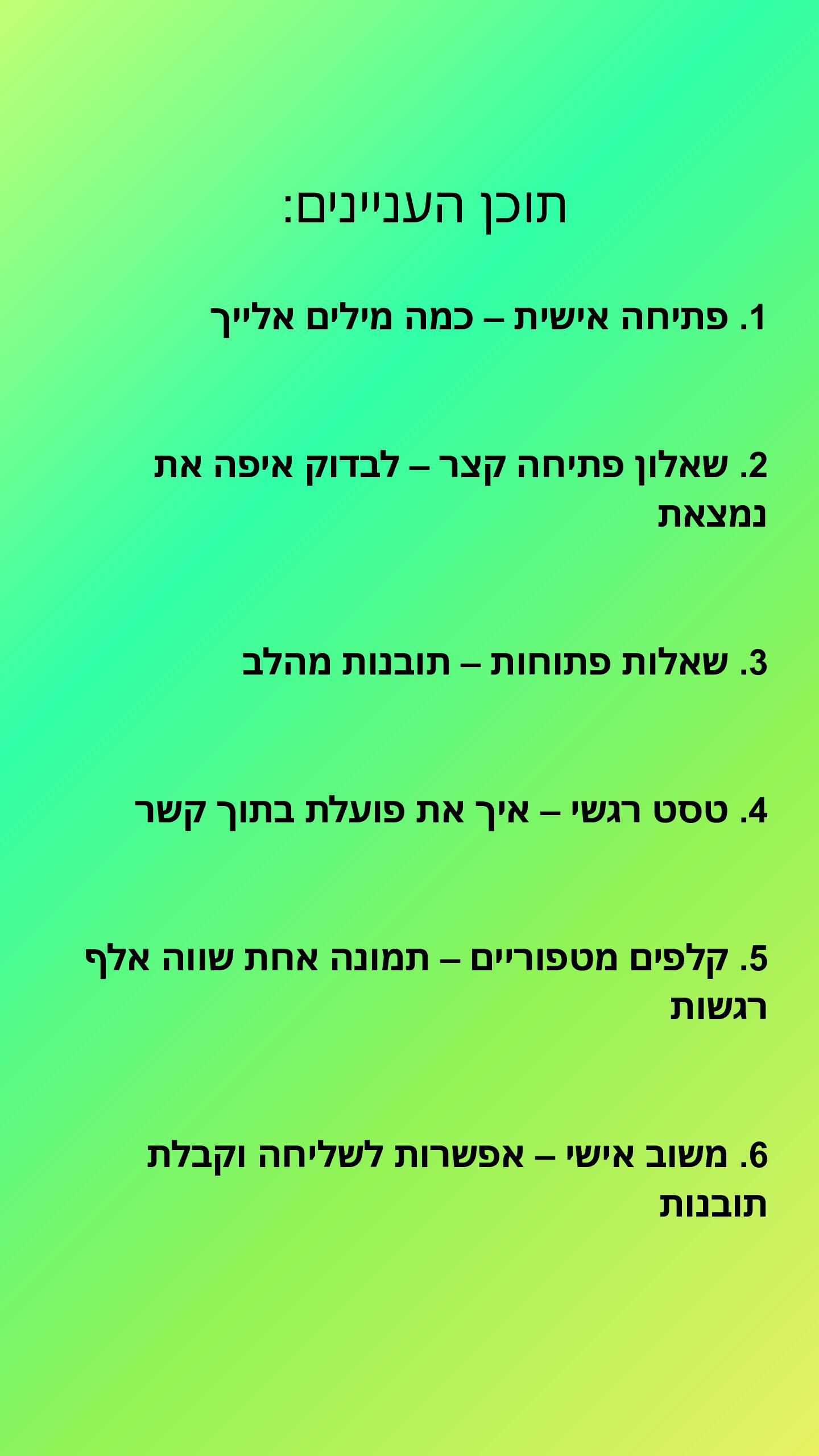 פחדים, רצונות, או אולי געגוע למשהו אחר. זהו כלי עדין שיכול לעזור לך למצוא נקודות חדשות להתבוננות על הלב והקשר שלך.